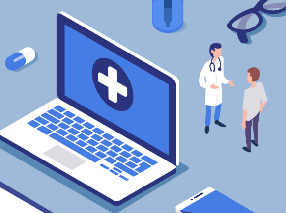 Animated illustration showing a laptop with a cross symbol on the screen, a pill, a pair of eyeglasses, and a doctor speaking with a patient.